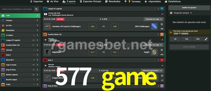 O 577 game oferece uma grande seleção de opções de apostas em e-sports com probabilidades competitivas